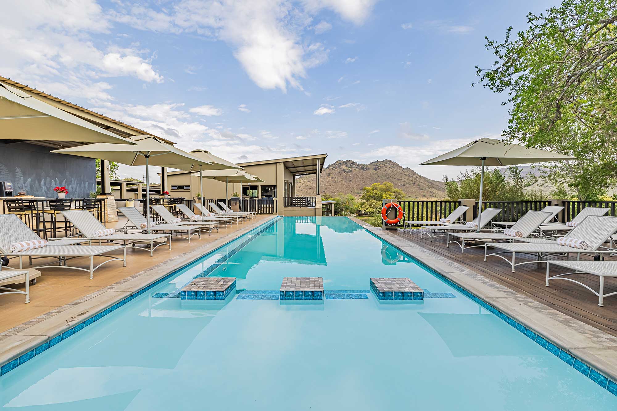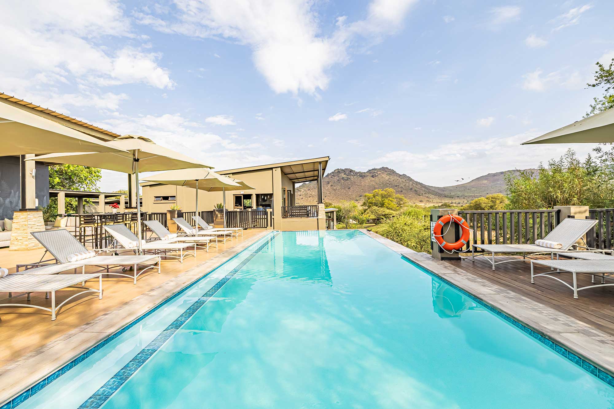 A spacious entertainment deck with an outdoor cocktail bar overlooking a spectacular rim-flow swimming pool.